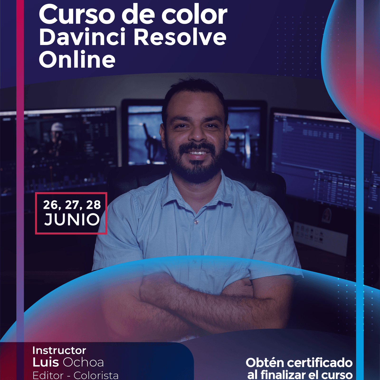 Se impartió el contenido de corrección de color primaria, balance, orden de nodos y gestión de color, creación de looks cinematográficos y export de proyectos.
